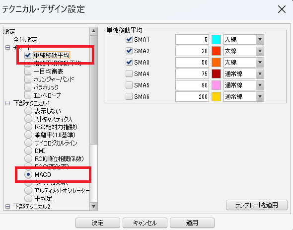 インディケーターは、「移動平均線」と「MACD」と言う2種類のみです。