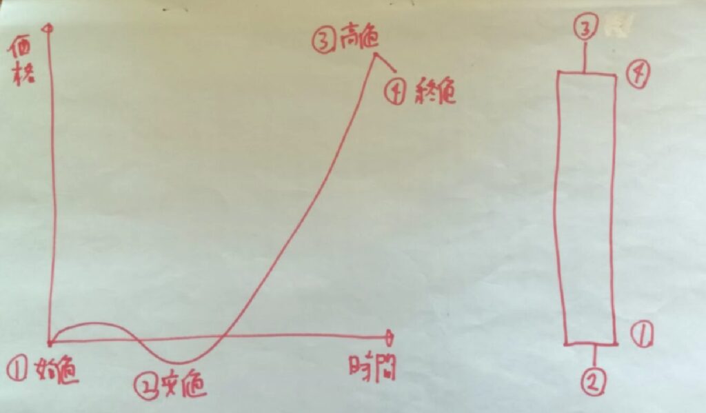 1日の「最初と最後」で「始値よりも終値は上にきた」⇒「陽線確定」ということです。