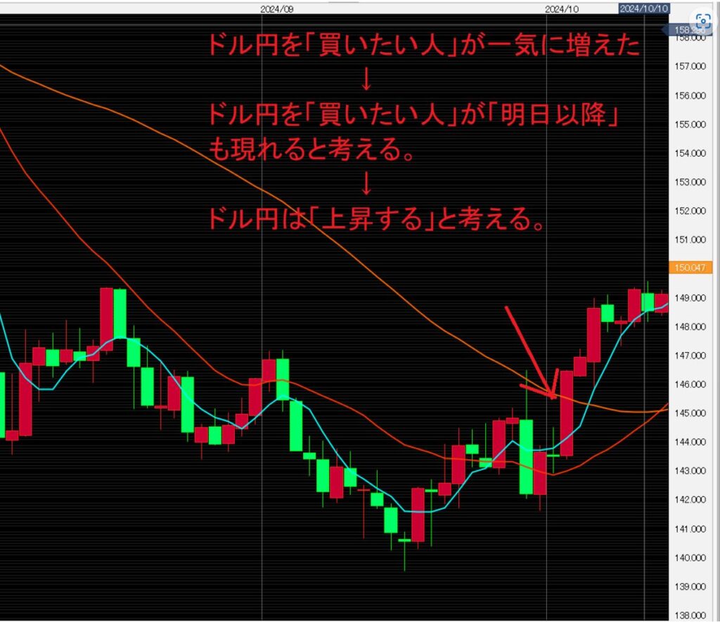 「ドル円の長い陽線=ドル円を買いたい人が多くなった」→「翌日以降、価格は上昇しやすくなった」ということです。