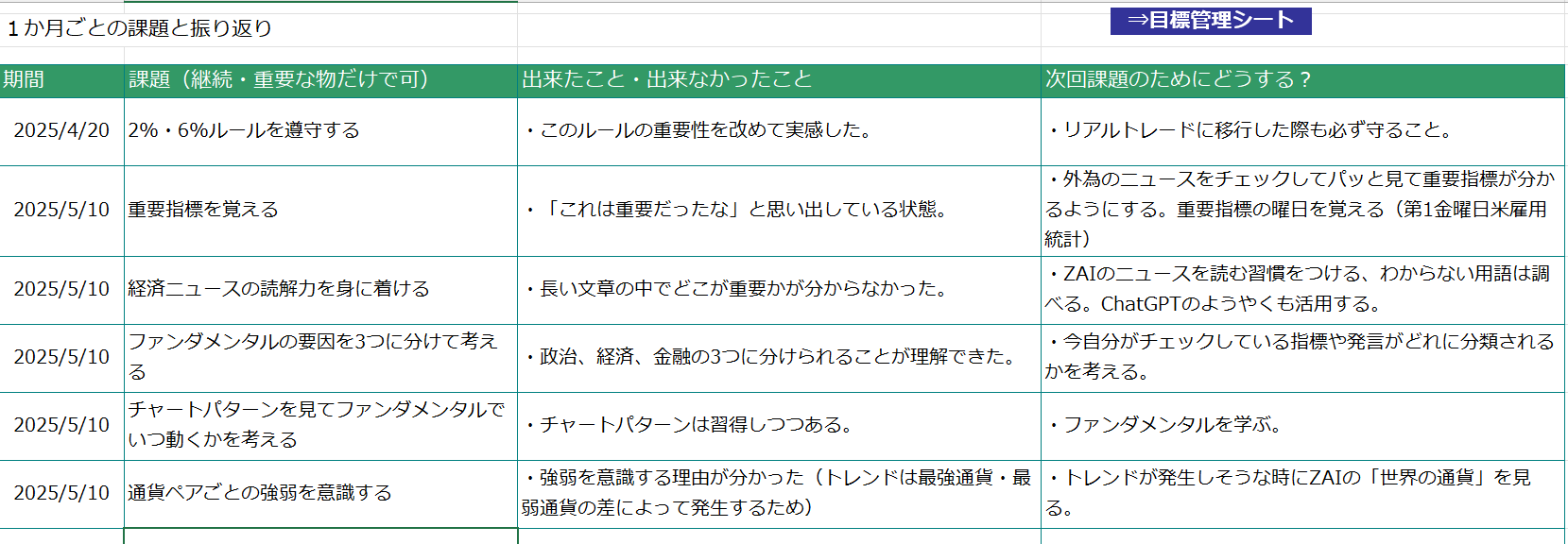 このシートは、単なるスタート時の確認書ではなく、日々の学びやトレードにおける軌道修正の指針として、講師・スタッフが継続的に活用します。