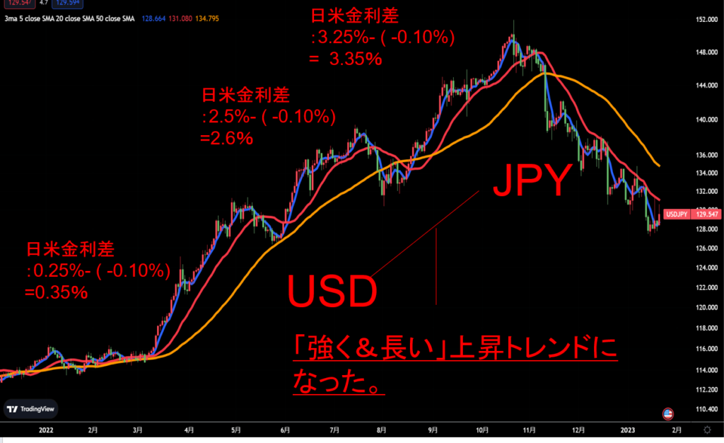 たとえば、2022年から2023年にかけてのドル円相場は、日米金利差の拡大により非常に分かりやすいトレンドを形成していた。