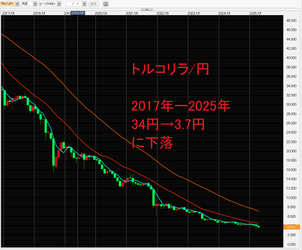 近年、メキシコペソよりも、さらに下落しているのが「トルコリラ/円」