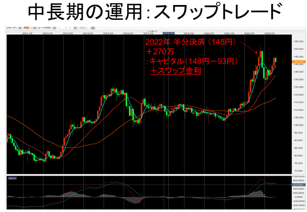 ② 2022年、ドル円を「148円」で半分決済。利益(変動益)は、270万。それに加え、スワップ利益も〇十万円。