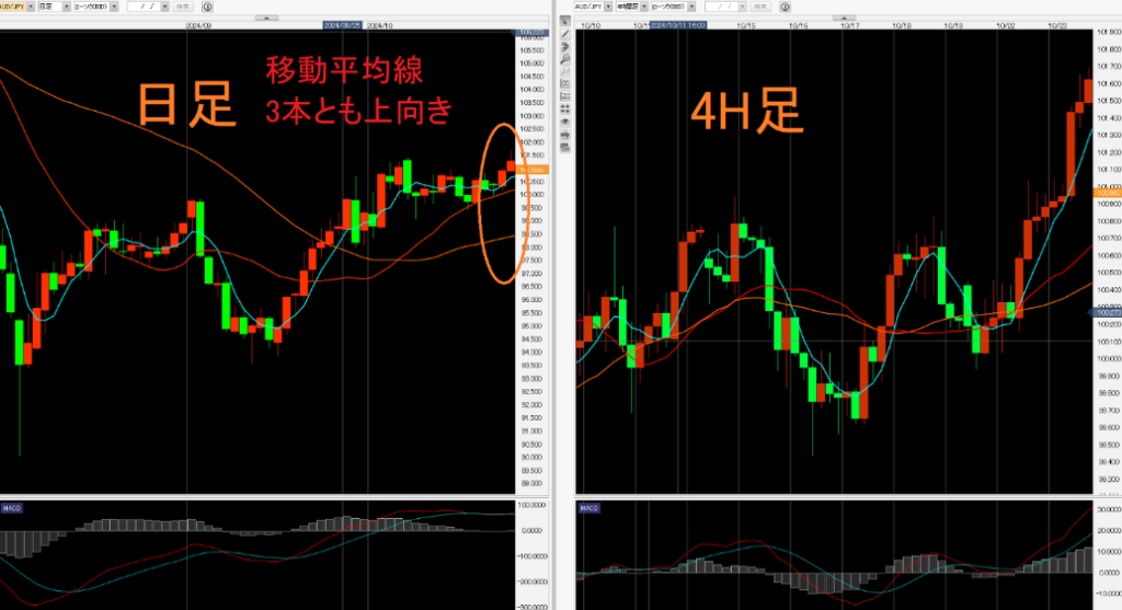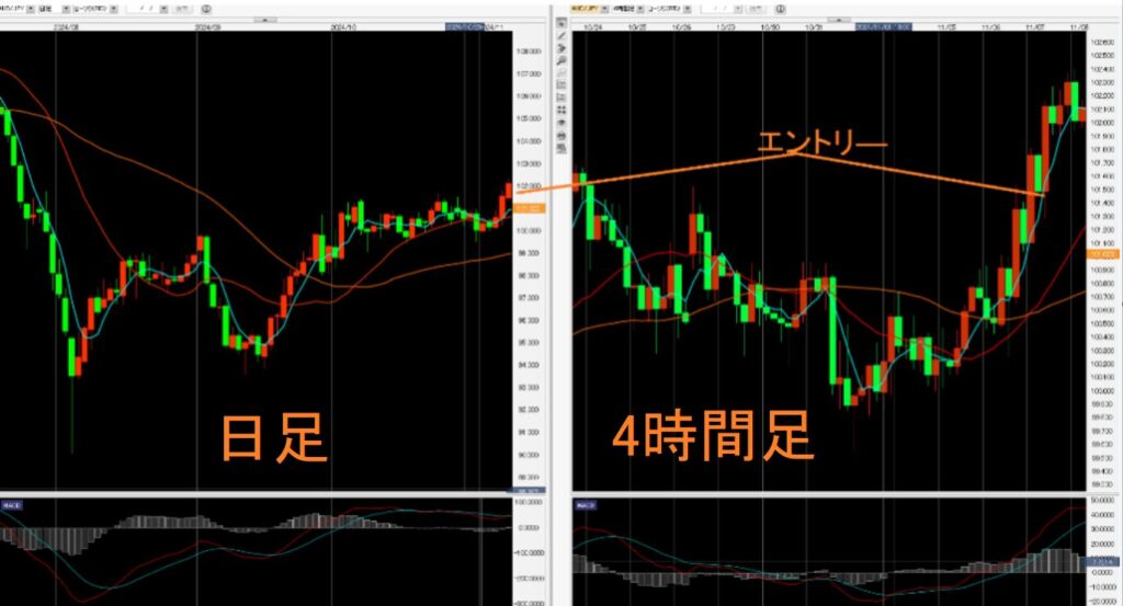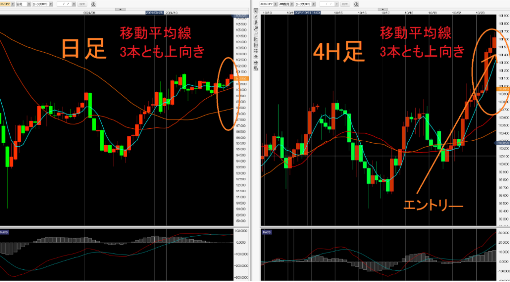 ② 4時間足:こちらも3本とも上向き。→ 条件クリア! と思ってエントリー。