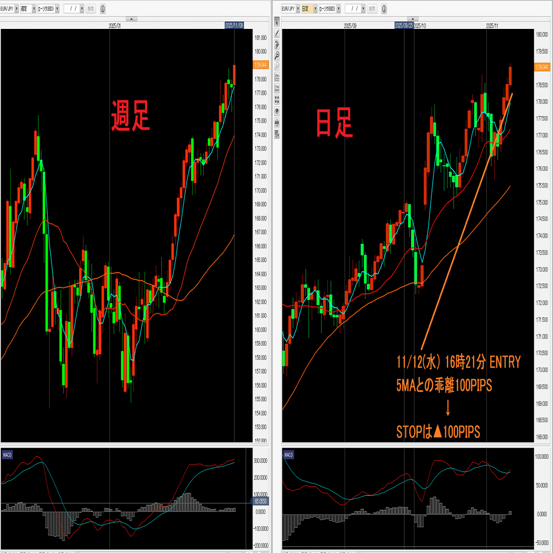 先週(11/12)  ユーロ円を「週足・日足」でロングポジションをとった。