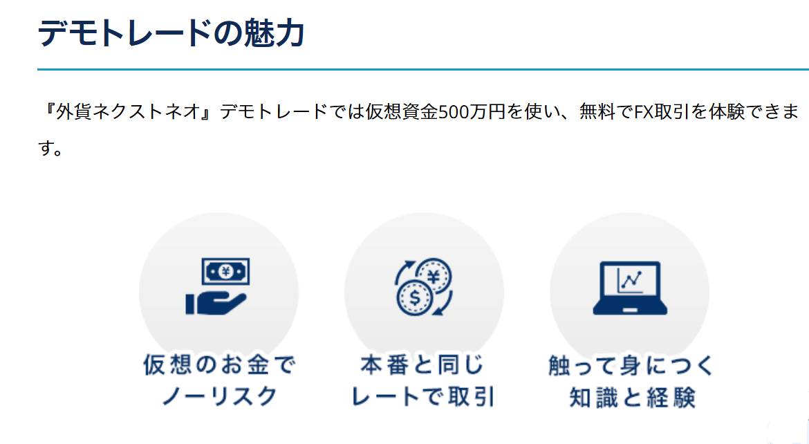 「デモトレードができる口座」を選べば、実際のトレードの流れをつかむことができ、損失のリスクなく経験を積めます。