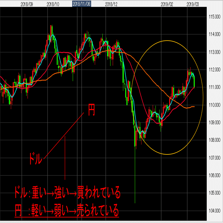 この場合は、円が売られる=人気が相対的に弱いという構図になる。