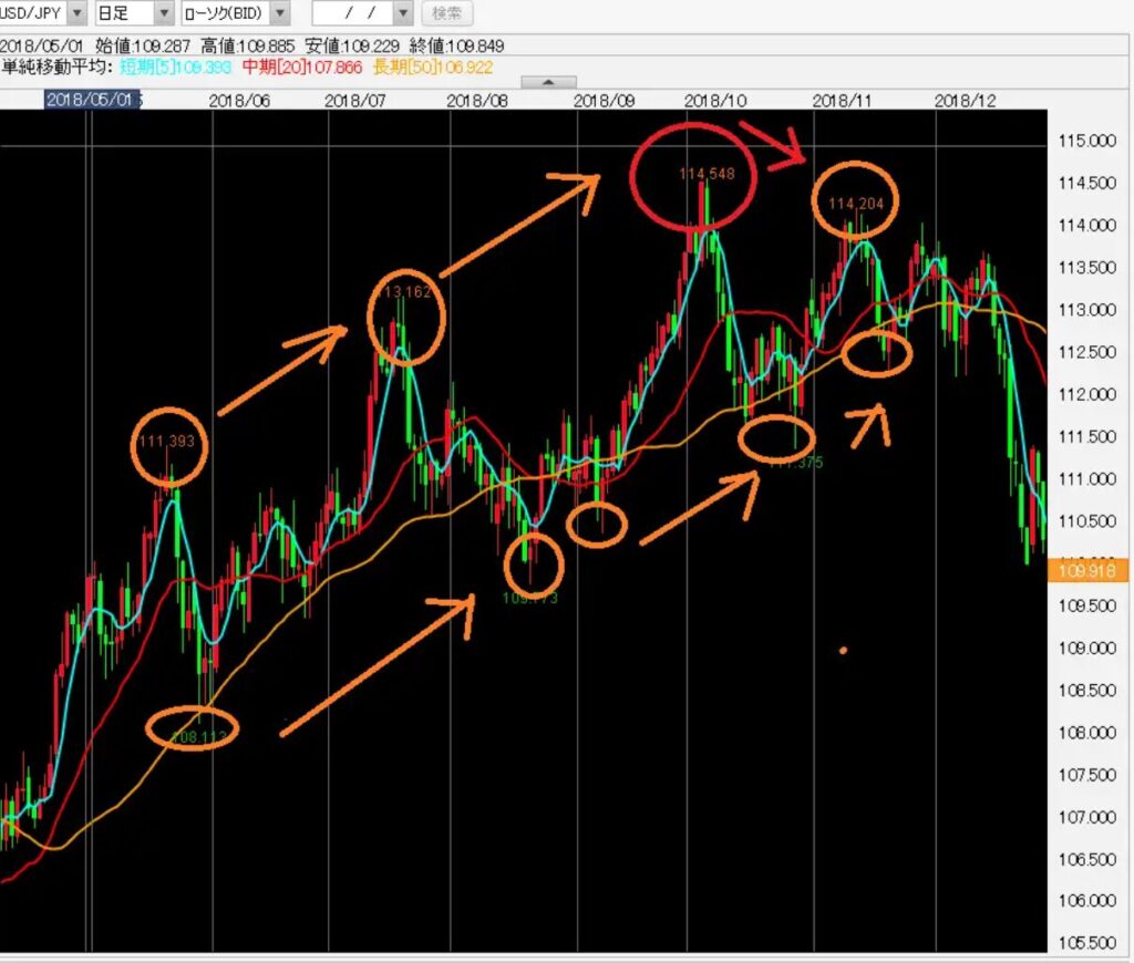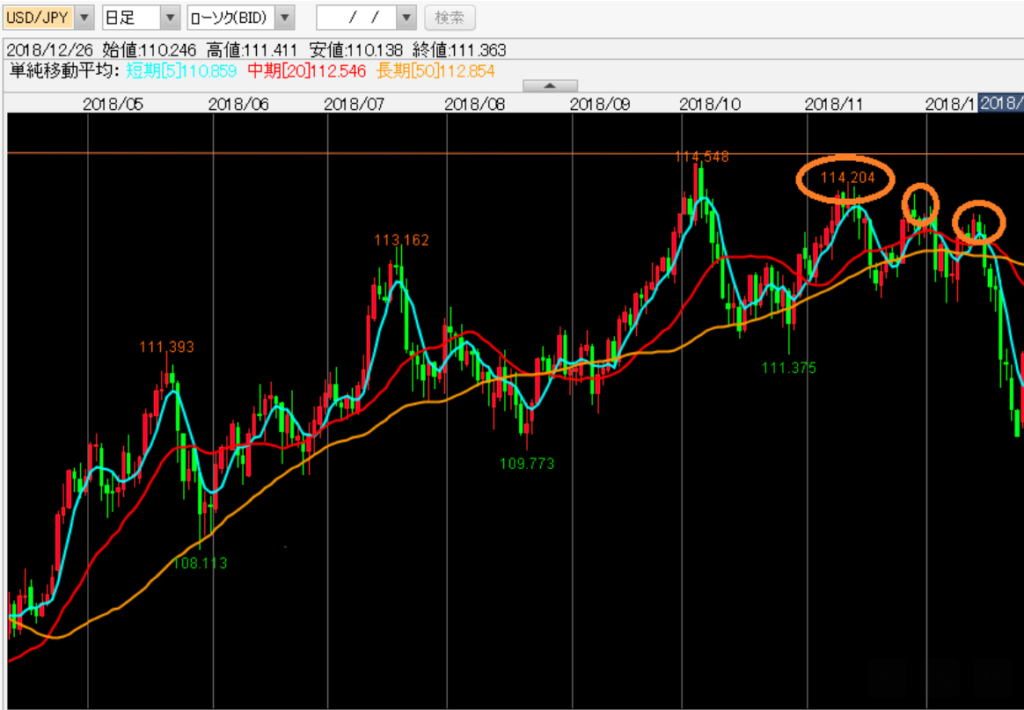 下記のドル円日足チャート(2018年5月―12月)には、3つのオレンジの〇印がある。