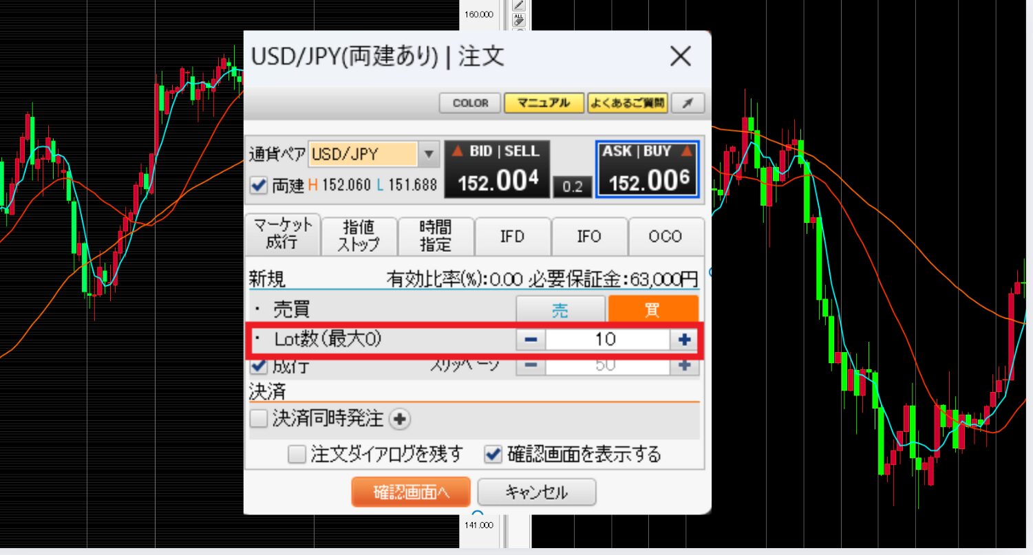 デモチャートで取引しながら、「ロットの入力の仕方」についてもわかりやすく説明します。
