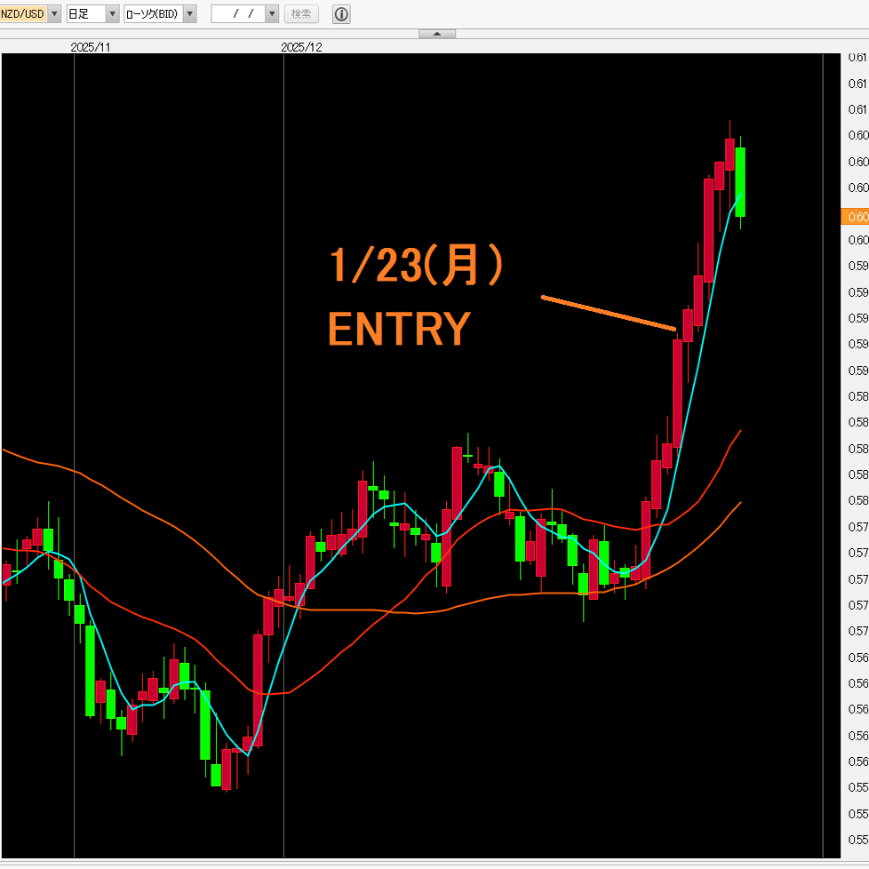 今週は、26日(月)の朝8時30分、「21世紀のAIトレード:週足日足+AI」の考え方で、NZDUSDのロング(買い)ポジションを保有した。