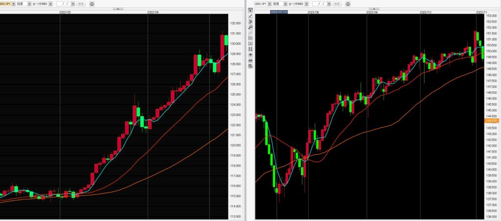 ドル円の日足チャートの比較。どちらが「きれい」で、ど地らが「汚いチャート」だろうか?