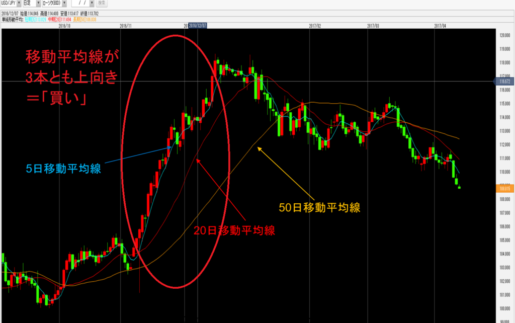 よって、トレードで重要なのは、短期・中期・長期の移動平均線が「同じ向き」になったとき です。