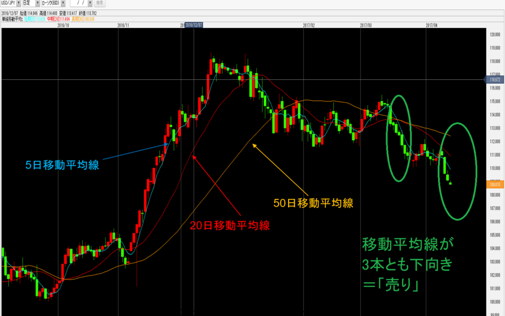 ✅ 3本の移動平均線が下向きの場合 →売りのチャンス!