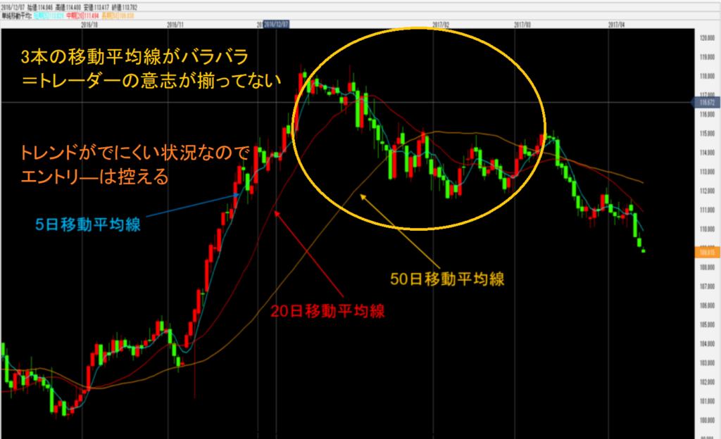 ✅ 3本の移動平均線がバラバラな場合 → トレーダーの意志が揃っていないので、方向感がでない。よって様子見