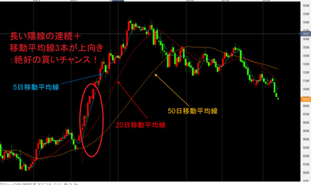 ✅ 長いローソク足の連続+移動平均線が同じ向き → エントリーのチャンス!