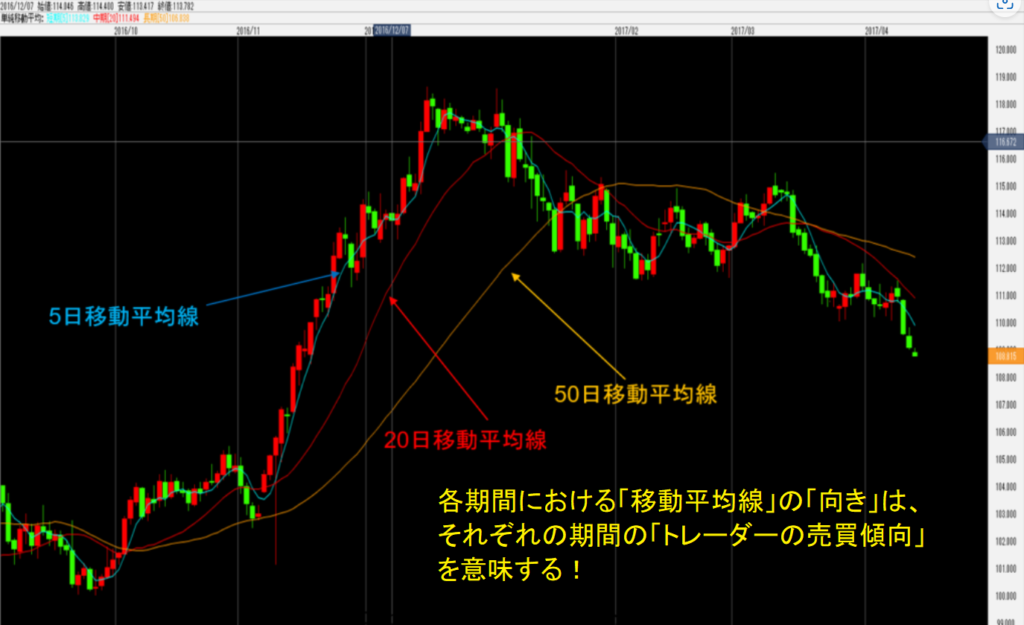 5日移動平均線が「上向き」ということは、「直近5日間でのトレーダーの売買傾向」は「買い」ということ。