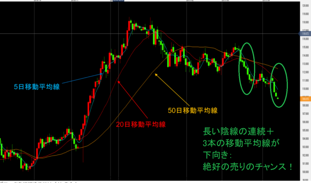 長い陰線が連続 = 下落の勢いが強いので、売りのエントリ―チャンス