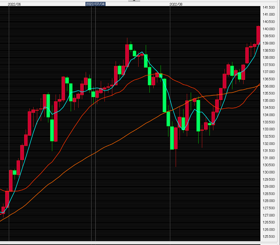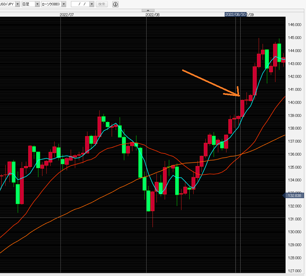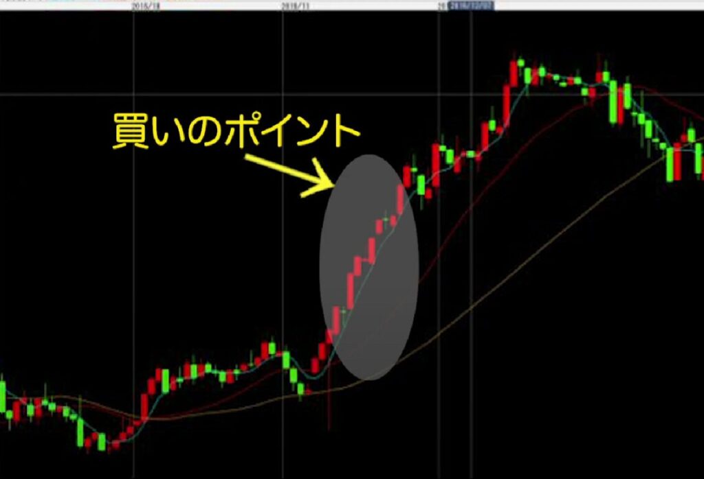 日足が「長いローソク足の連続+移動平均線3本がともに同じ上向きになった時」は、すぐにエントリーするようにしましょう。